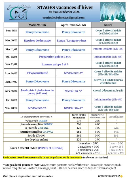 Ci-contre, le planning des stages d'été et leurs tarifs.